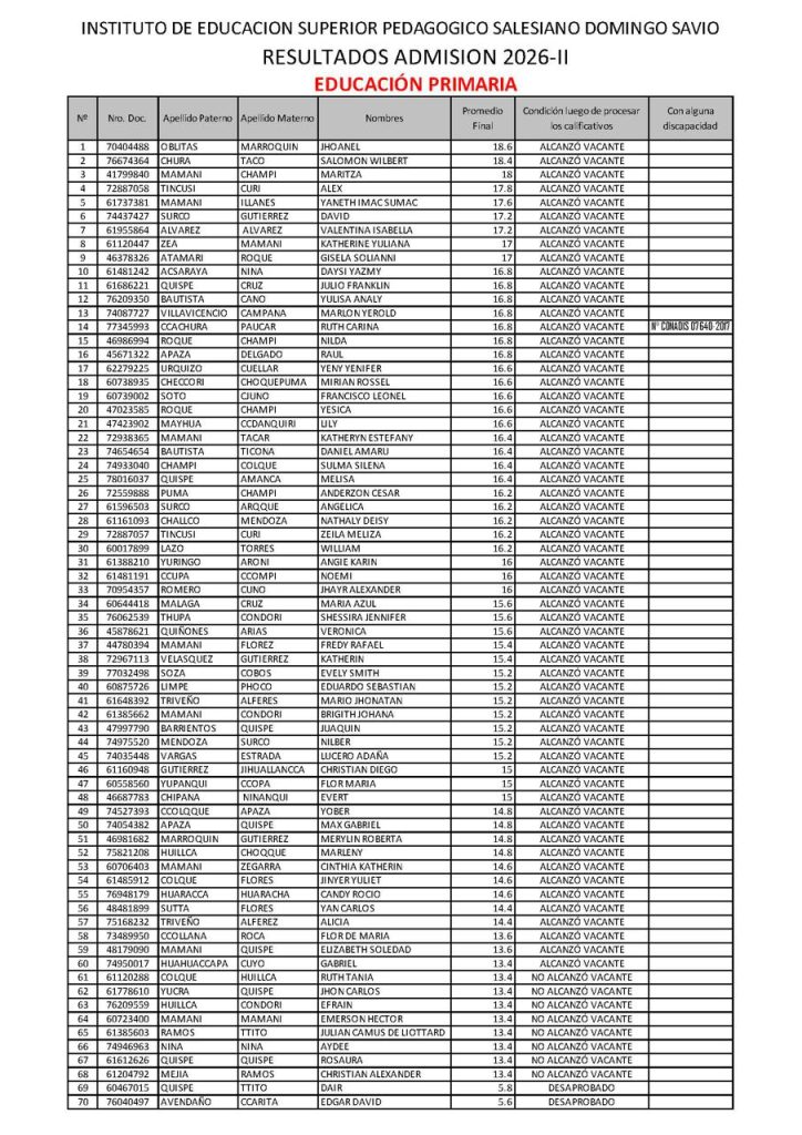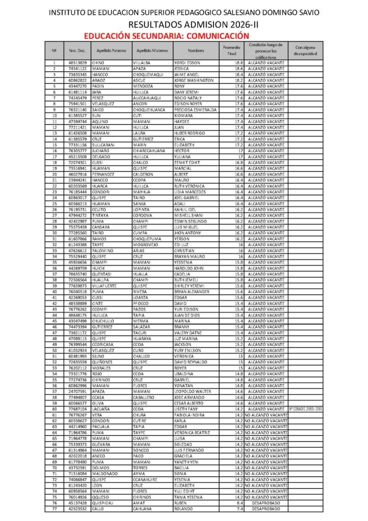 Resultados de Examen de Admisión 2026-I, realizados los días 06 y 07 de marzo del 2026, en los Programas de Estudios de: Educación Secundaria, especialidad: Comunicación y Educación Primaria